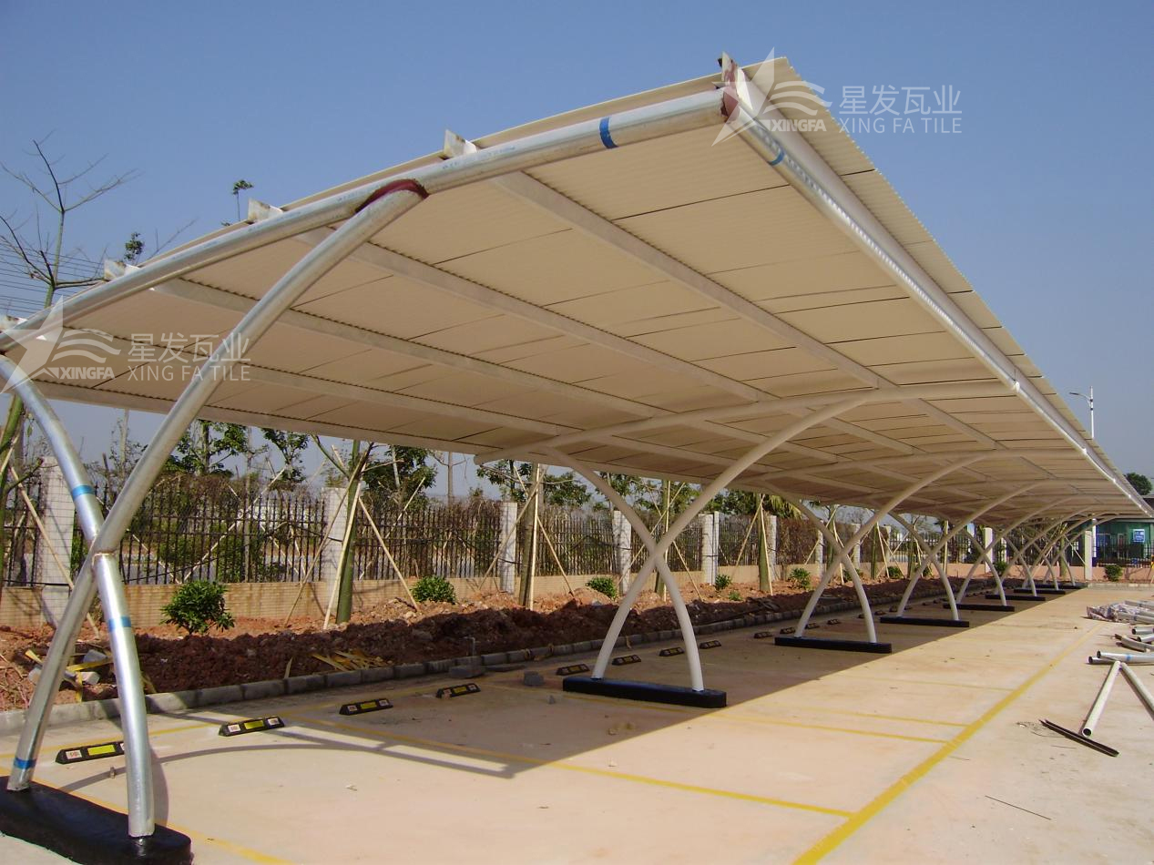 車(chē)棚和停車(chē)場(chǎng):由于PVC瓦的安裝簡(jiǎn)便性和防水性能,它們也常用于車(chē)棚、停車(chē)場(chǎng)和露天停車(chē)位的屋頂覆蓋。它們能夠有效地保護車(chē)輛免受日曬、雨水和其他天氣因素的影響。